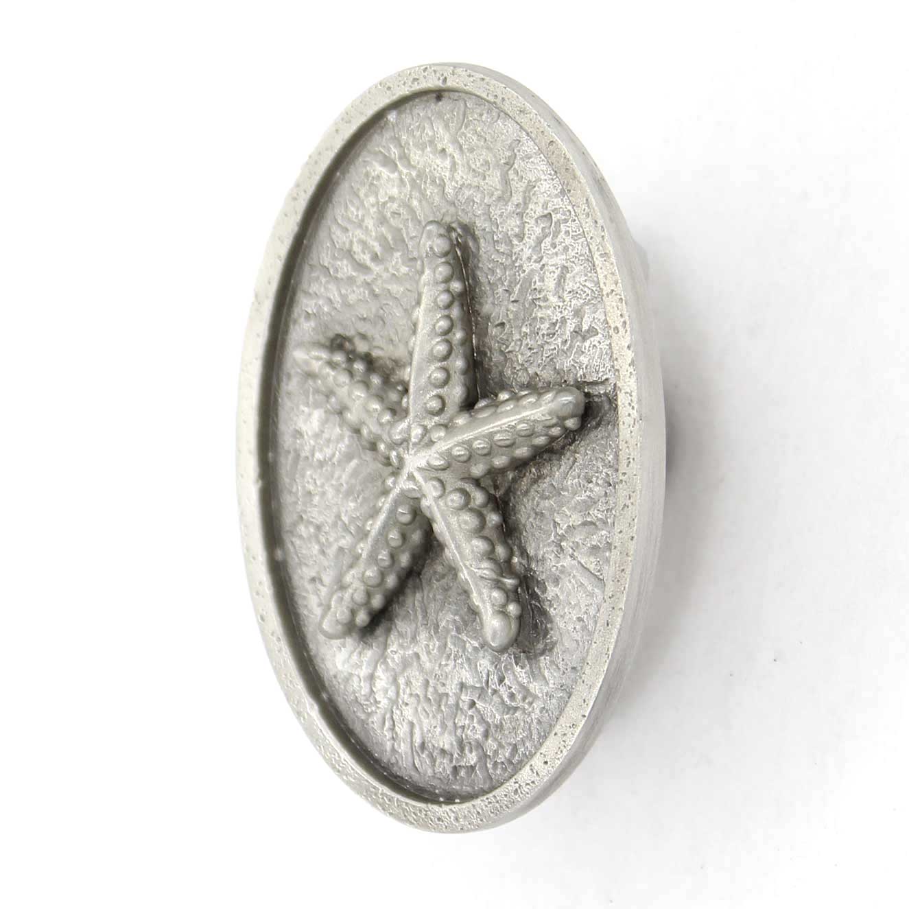 Starfish on a solid pewter textured oval. Dimensions: 2.2" tall x 1.6" wide knob. Copyrighted artwork by Peter Costello.  Priced individually.  Mounts on single brass reinforced post.  1” mounting screw included. Free shipping to USA addresses. Most orders ship within 24 hours