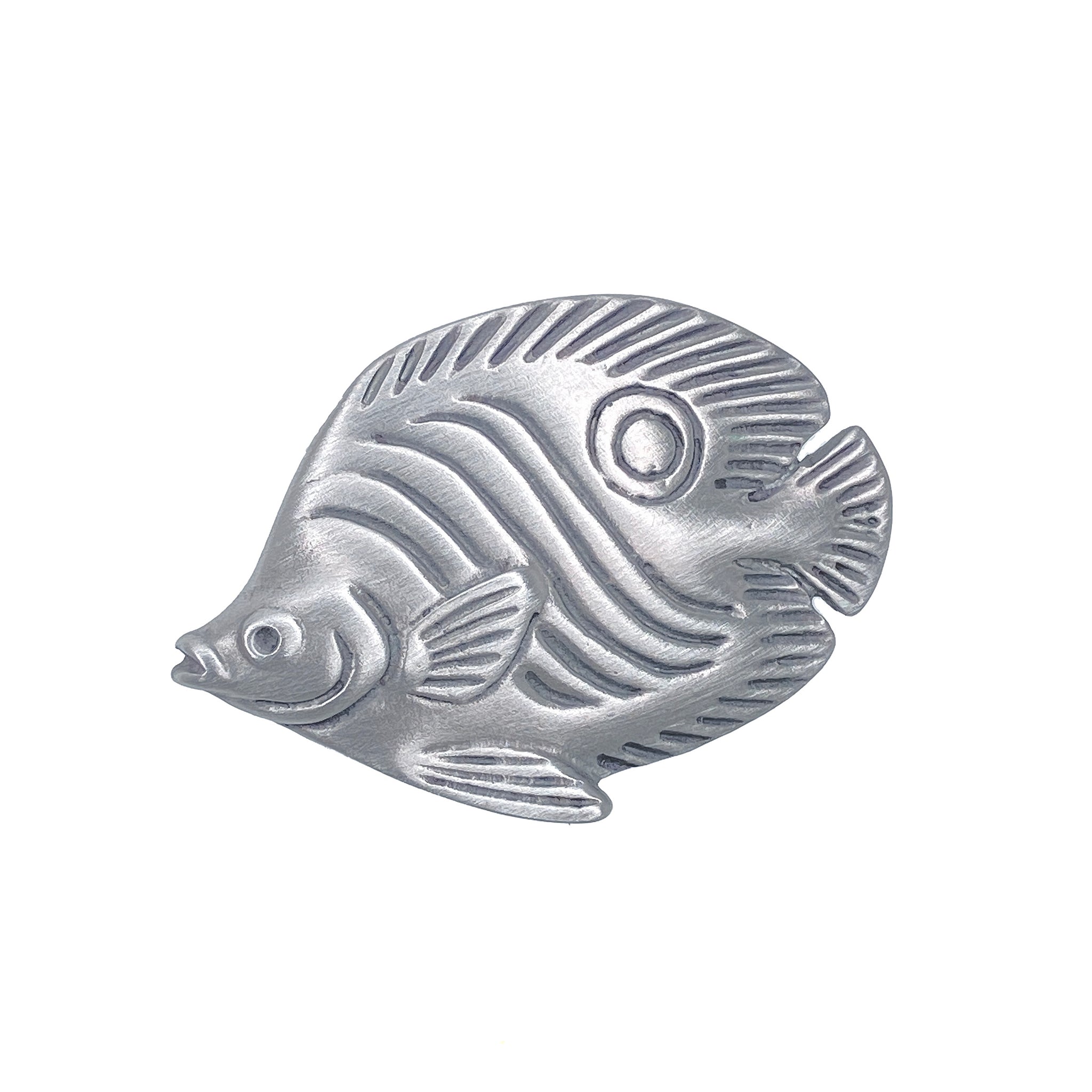 Butterfly Fish are boxy shaped reef fish with a protractile pointed mouth. They are nimble feeders, able to swim upside down to reach food. Brightly colored yellow across back and dorsal fin, butterfly fish have two vertical black bars that run down through eyes as well as just in front of tail. The very end of the dorsal fin is decorated with a black spot. Peter Costello’s butterfly fish cabinet knobs will bring the beauty and playful spirits of ocean reef fish into your coastal kitchen or bathroom.